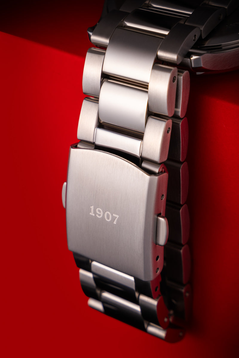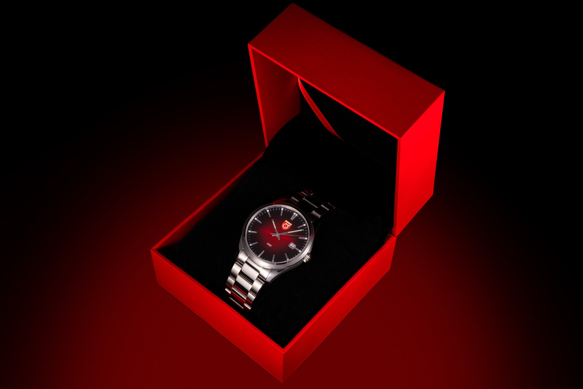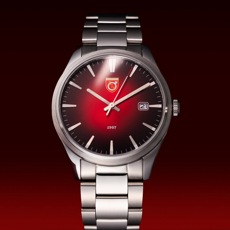 Detta armbandsur är skapad för dig att bära med dig vår historia, vår stolthet och vår gemenskap. Den röda urtavlan pryds av klubbemblemet. På tavlan återfinns årtalet 1907, året när klubben bildades. Sekundvisarens spets bär vår färg - ett subtilt uttryck för vår identitet.